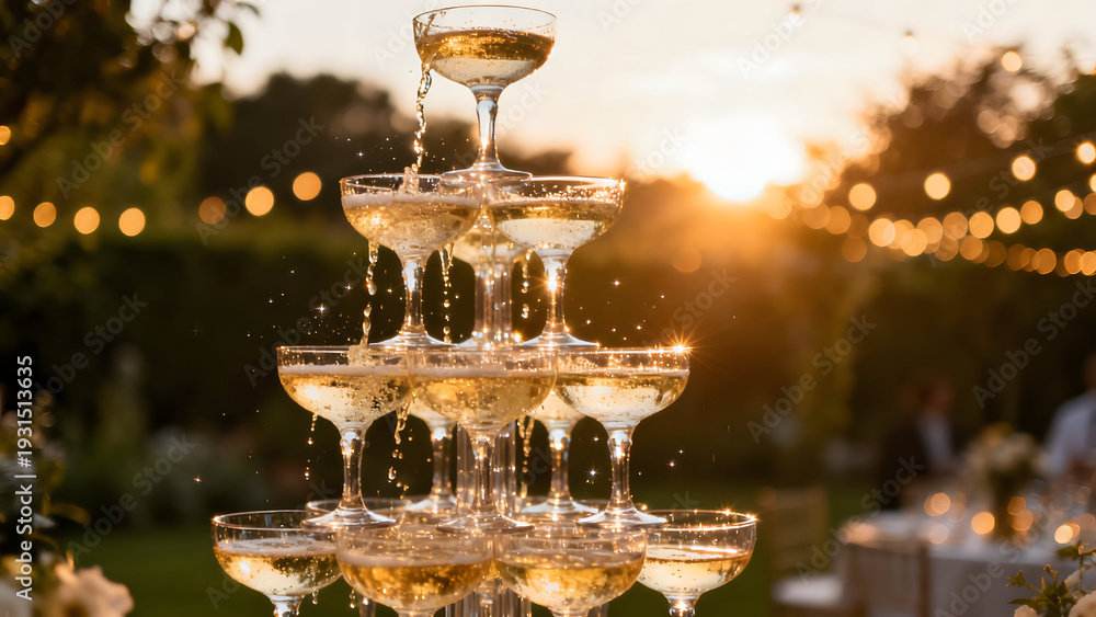 Sparkling Pyramid of Celebration: Champagne cascading gracefully into a towering pyramid of glasses, illuminated by the warm glow of the setting sun, creating a picture of celebratory elegance. #1931513635