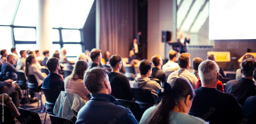 Speaker giving a talk in conference hall at business event. Rear view of unrecognizable people in audience at the conference hall. Business and entrepreneurship concept #1401219526
