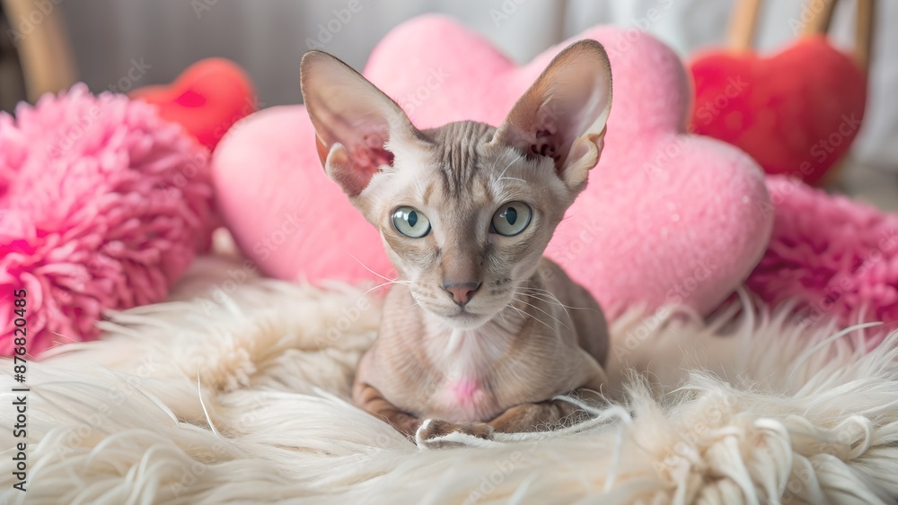 Sphynx cat relaxing on a white fur blanket with pink plush hearts and flowers #876820485