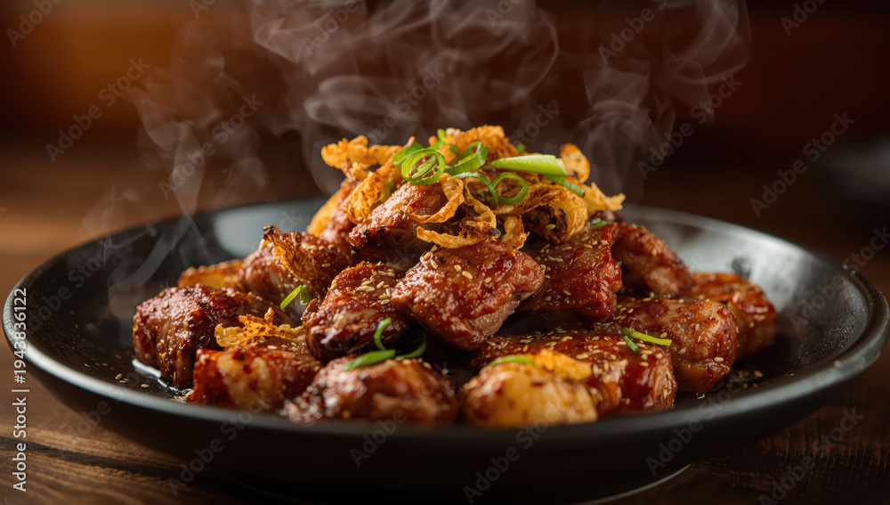 Spicy grilled pork bites with scallion and fried onion garnish, steaming and savory #1943836122