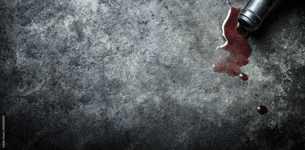 Spilled wine bottle, gritty concrete background, dark moody lighting, red liquid stain, dramatic crime scene atmosphere, textured surface, copy space #1643601616