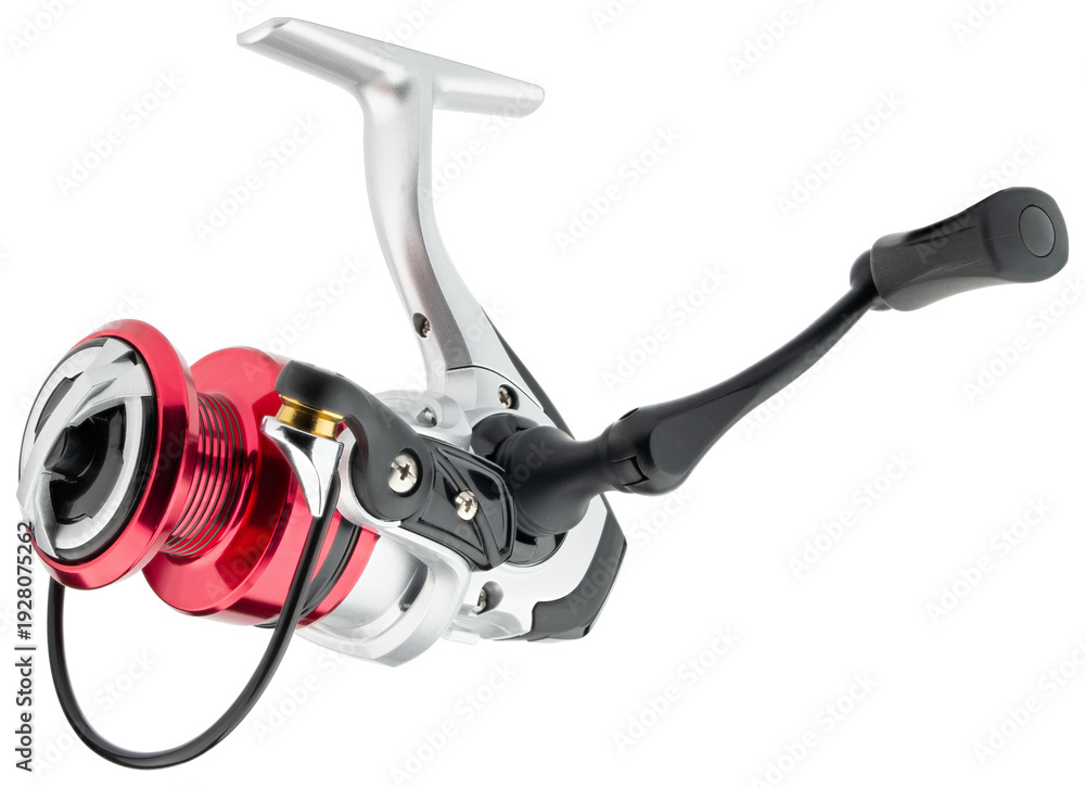 Spinning fishing reel with metal spool and ergonomic handle. Professional angling equipment for freshwater and saltwater fishing, casting, spinning, sport fishing and outdoor recreation use. #1928075262