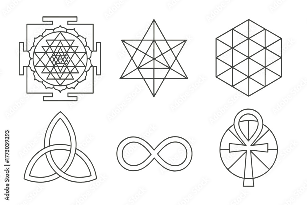 Spiritual Geometry Icons. Line style icons of Spiritual Geometry Symbols: Sri Yantra, Merkaba star, hexagram grid, triquetra knot, #1773039293