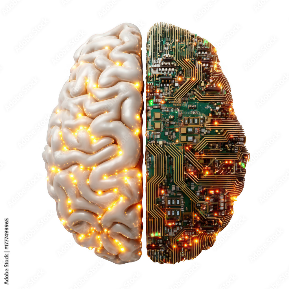 Split brain concept illustrating biological and digital intelligence fusion isolated on transparent background #1777499965