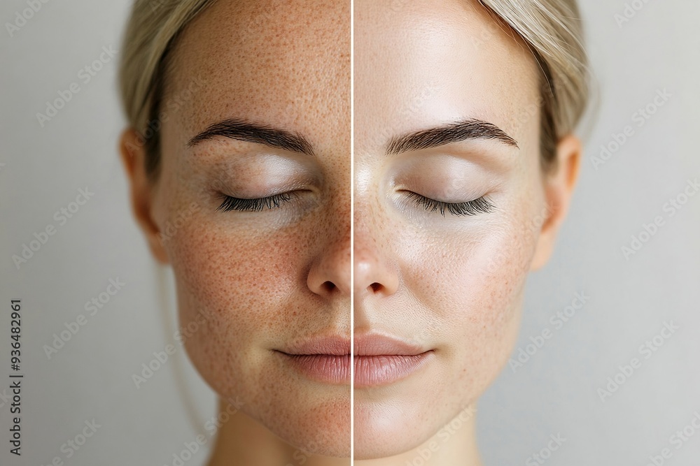 Split face of woman showing before and after effect of pigmentation lightening procedure. Cosmetic treatment and spa concept. Close-up collage portrait for poster, commercial, presentation #936482961