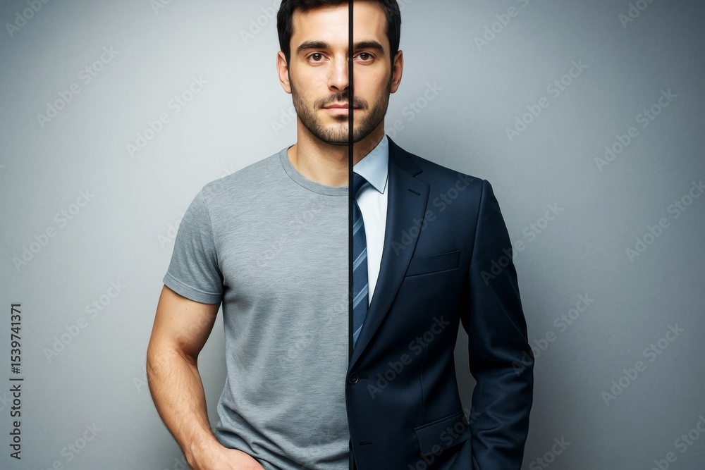 Split image of a man in casual t-shirt and formal suit showing contrast of personal and professional appearance on neutral background light. #1539741371