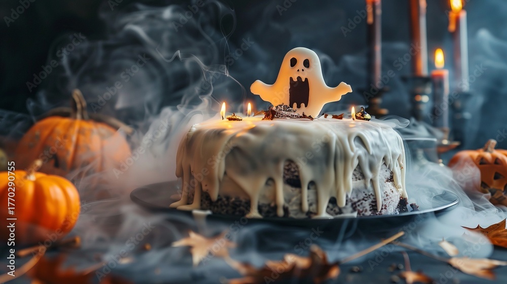 Spooky Halloween cake with ghost decoration, candles, and pumpkins surrounded by smoke and autumn leaves. Perfect for Halloween, party, and festive design themes. #1770290755