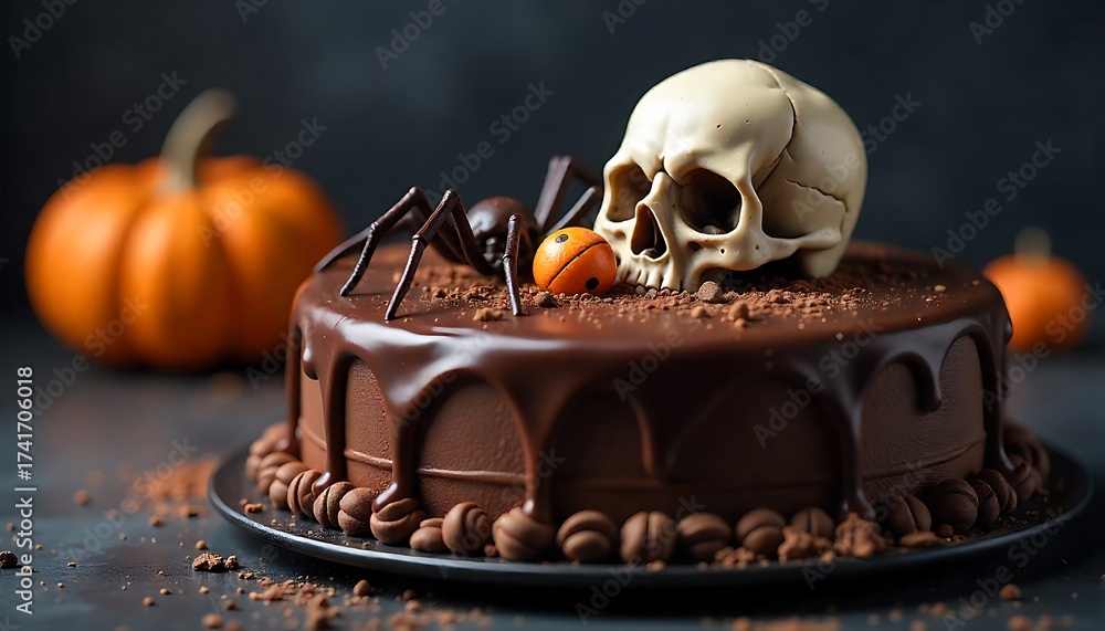 Spooky Halloween chocolate Cake with Skull, Eyeball, and Spider Decoration on dark background, Halloween party, created with generative ai #1741706018