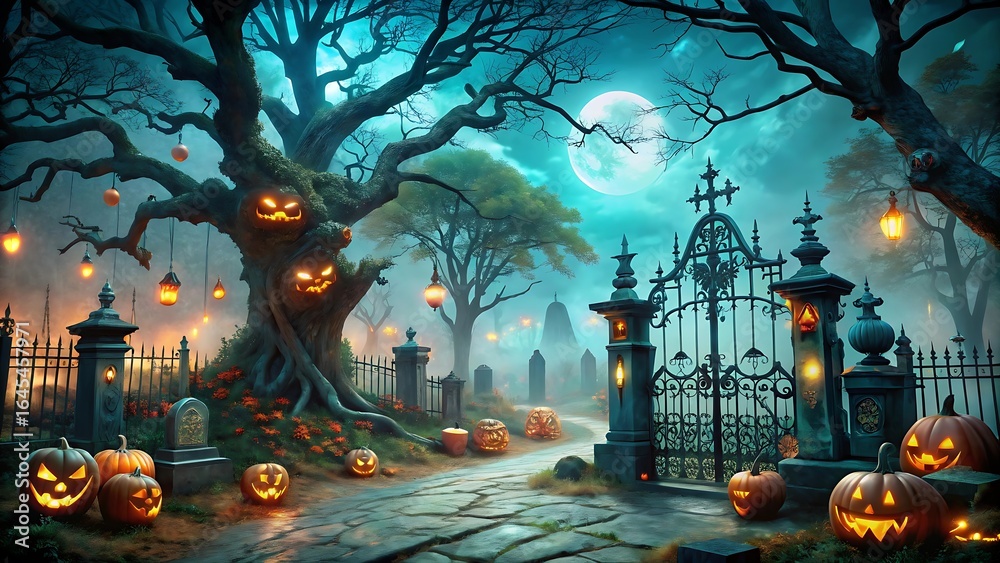 Spooky halloween graveyard scene with glowing pumpkins and a full moon #1645457971