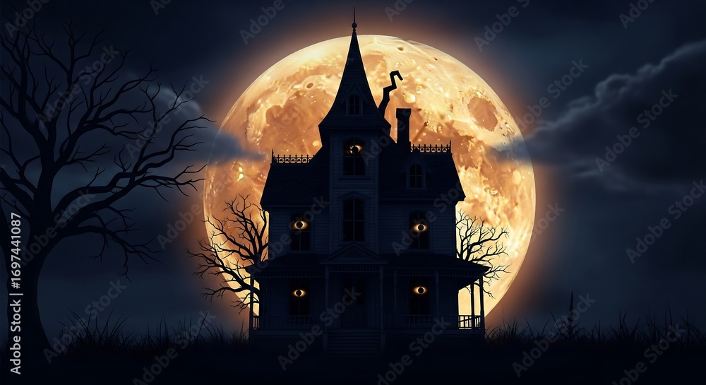 Spooky Halloween Haunted House Silhouette Against a Glowing Harvest Moon and Bare Trees Creepy Victorian Mansion with Glowing Eyes #1697441087