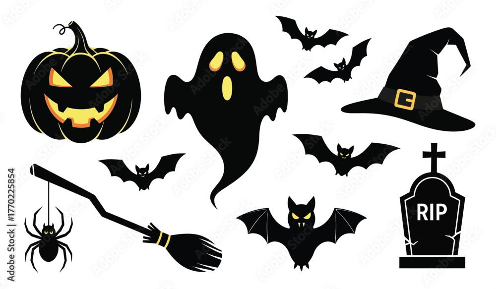 Spooky halloween icons featuring pumpkin ghost witch hat bats spider and tombstone for festive decorations isolated on white background #1770225854