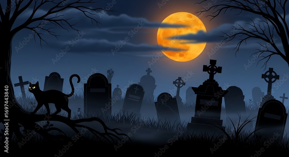 Spooky Halloween Night Cemetery Scene Black Cat Silhouette Tombstones and Harvest Moon Background for Spooky Season Designs Party Invitations or Greeting Cards #1697443840