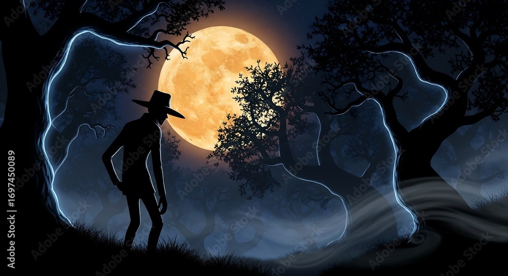 Spooky Halloween Silhouette Mysterious Figure in a Haunted Forest Under a Full Harvest Moon Digital Art Illustration #1697450089
