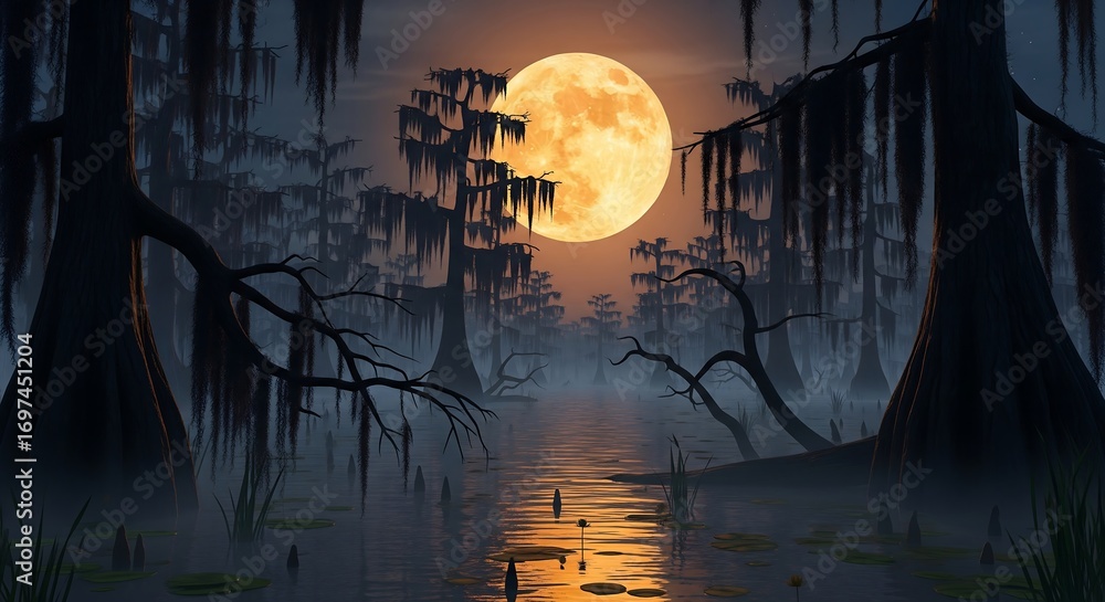 Spooky Halloween Swamp Landscape Under a Full Moon #1697451204