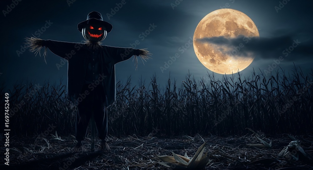 Spooky Scarecrow in a Cornfield at Night Under a Full Moon - Halloween Theme #1697452449
