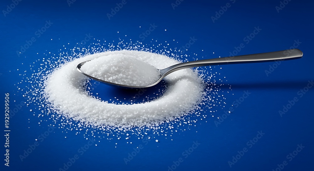 Spoonful of white sugar on blue background with scattered crystals sugar #1929209506
