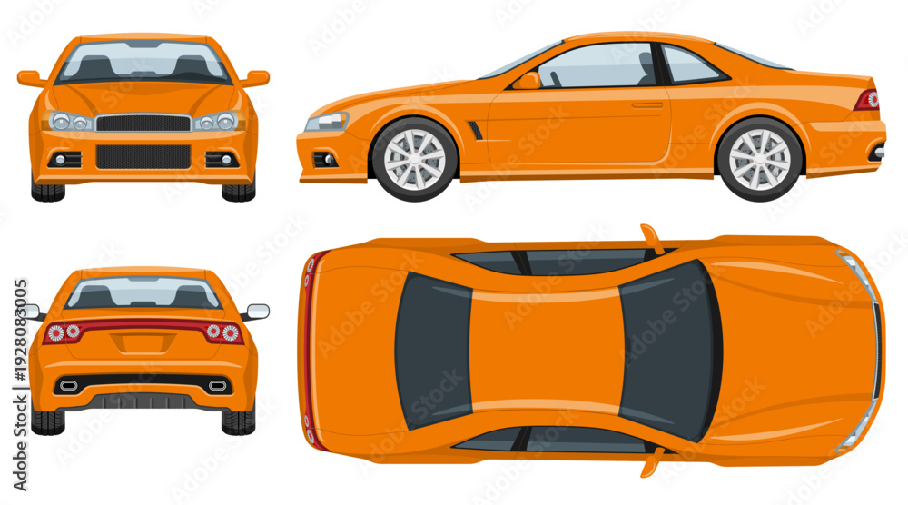Sports car vector template with simple colors without gradients and effects. View from side, front, back, and top #1928083005