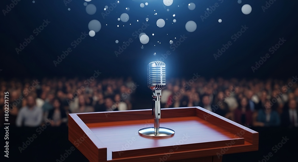 Spotlight shines on a vintage microphone on a podium, awaiting a speaker in front of a large audience #1802271715