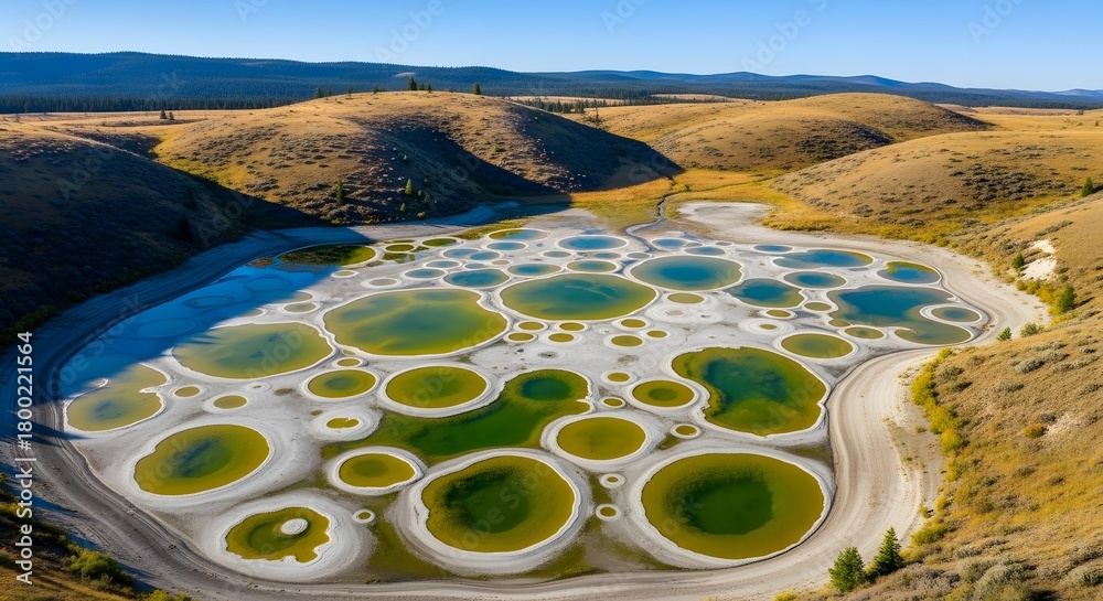 Spotted Lake: An aerial view showcases the mesmerizing beauty of a unique natural phenomenon, where vibrant mineral deposits create a stunning display of colorful circles in a serene lake. #1800221564