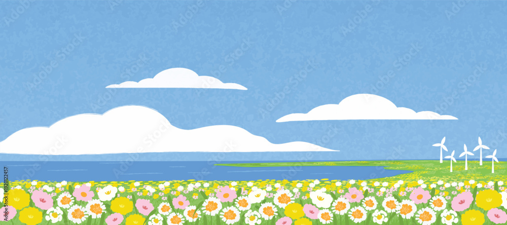 Spring and Summer landscape background vector set. Nature wallpaper of flower field with blue sky and sea illustration for cover, wall art, decoration. #1920122457