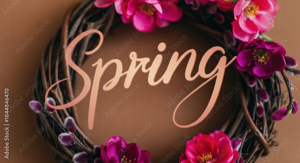 Spring wreath adorned with pink blossoms and pussy willow accents on brown background #1844846470