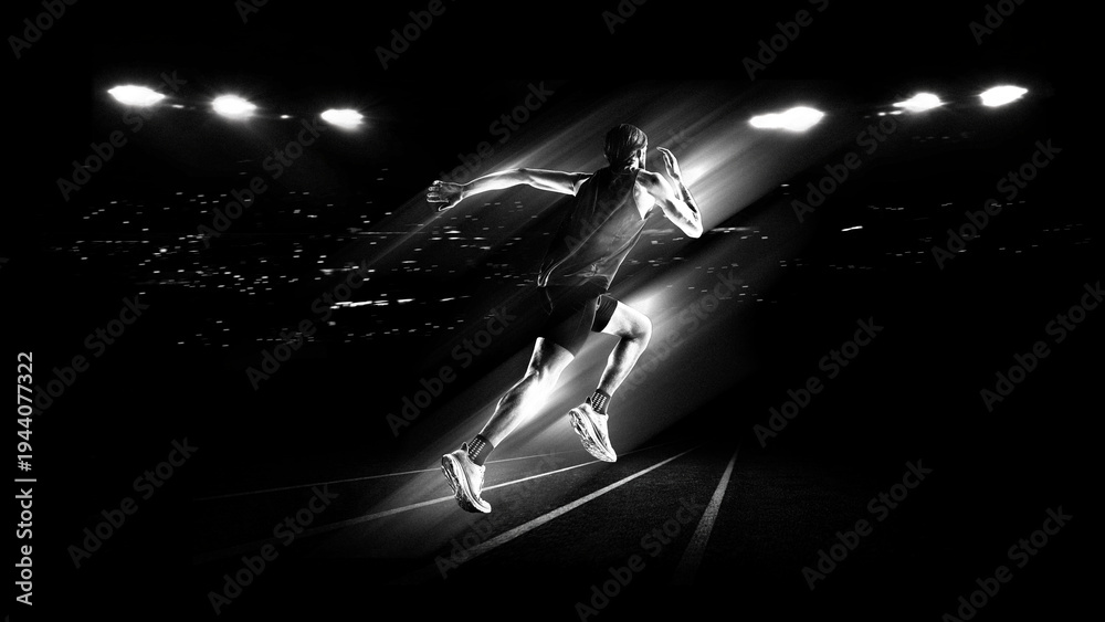 Sprinter accelerating with light trail motion effect on stadium track used for athletics advertising, sports marketing and performance training campaigns. #1944077322