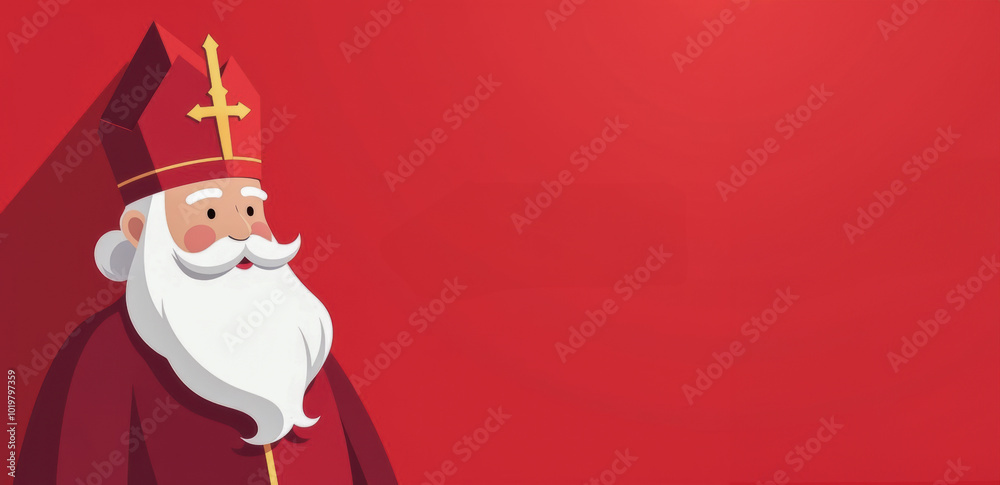 St Nicholas Cartoon Illustration in Traditional Red Bishop Attire with White Beard on Bright Background for Sinterklaas Celebration Concept #1019797359