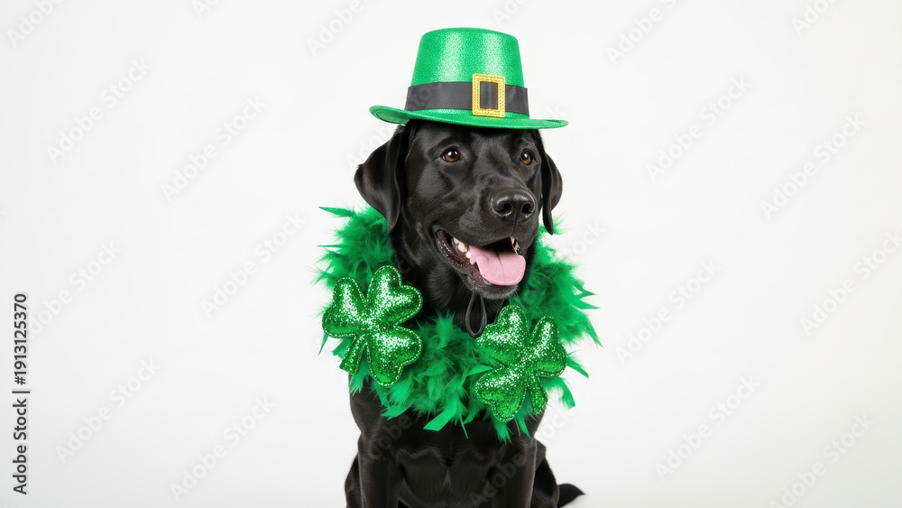 St. Patrick's Day. friendly Black Labrador Retriever sitting, wearing a festive green on white background #1913125370