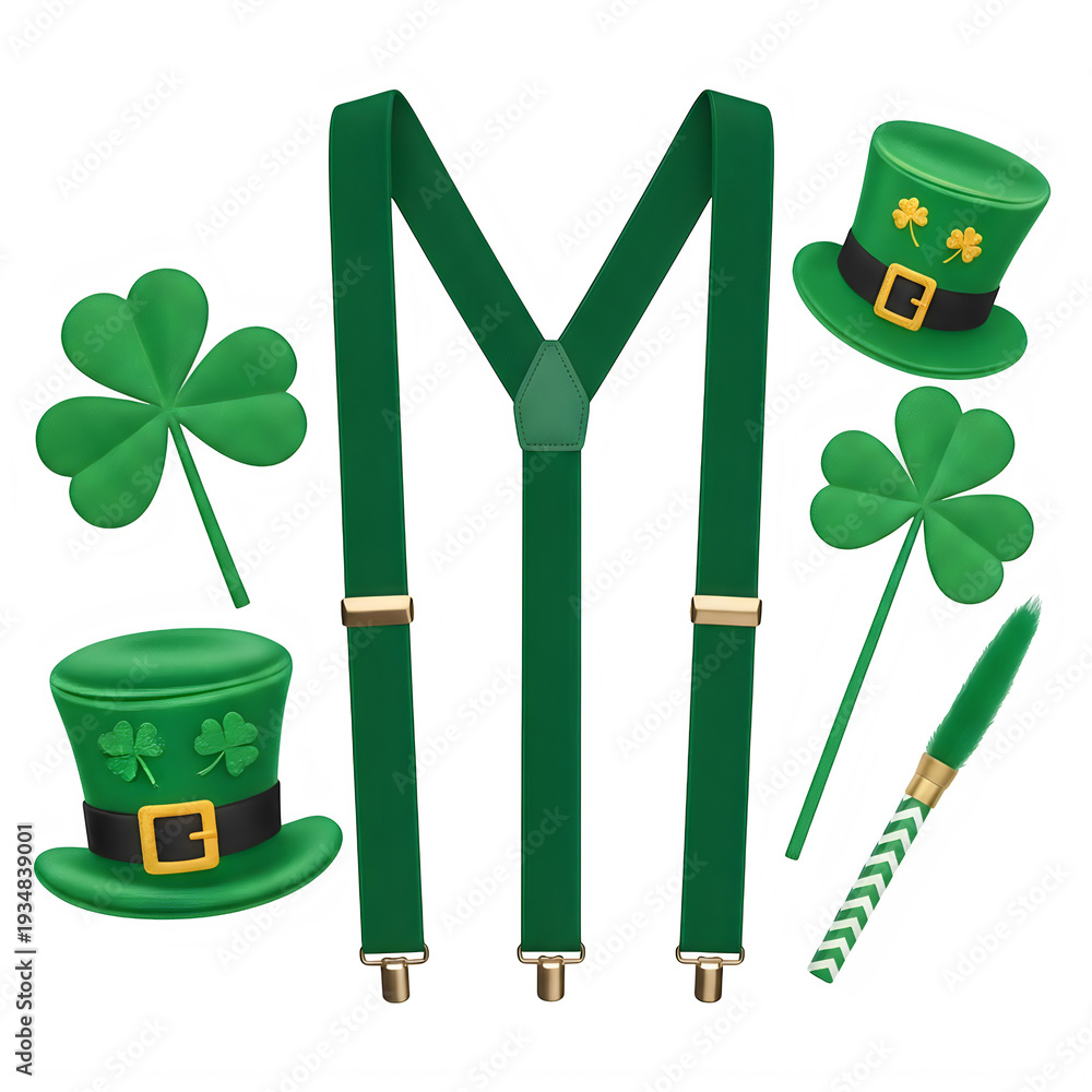 St. patrick's day symbols including shamrocks, hats, and instruments isolated on transparent background #1934839001