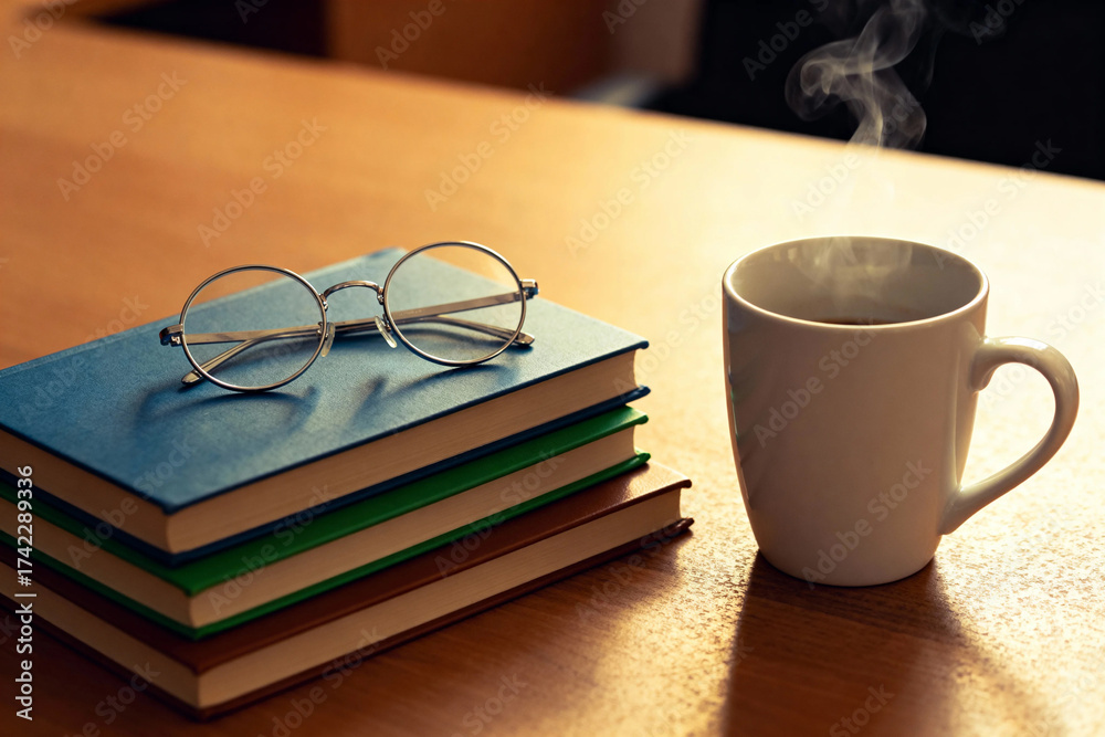 Stack of books with reading glasses and coffee: Publishing, Bookstores, Lifestyle, Education #1742289336
