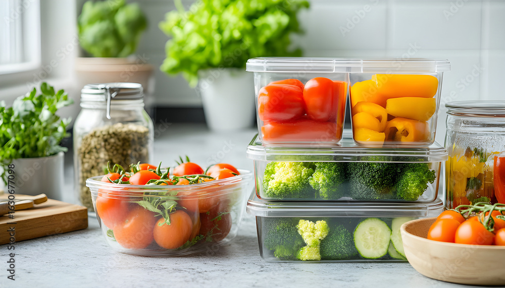 Stack of clear food containers filled with fresh vegetables like tomatoes, broccoli, peppers. Organized kitchen scene promotes healthy eating, meal prep convenience #1630677098
