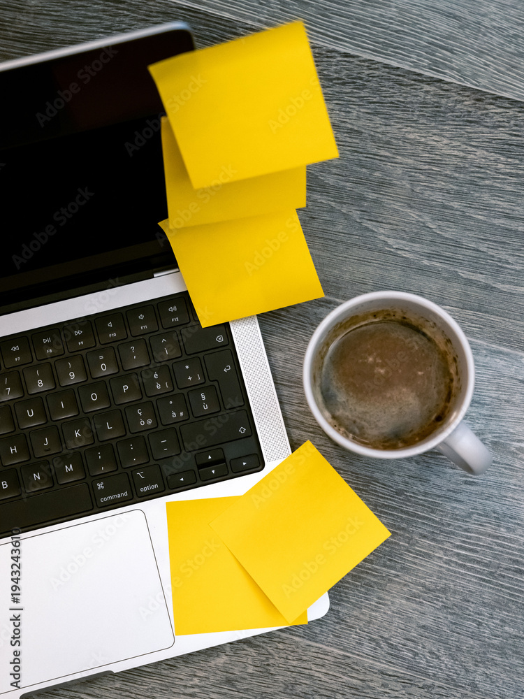 Stack of Empty Yellow Sticky Notes ready for text mockup Piled on a silver Laptop Next to a Coffee Mug #1943243610
