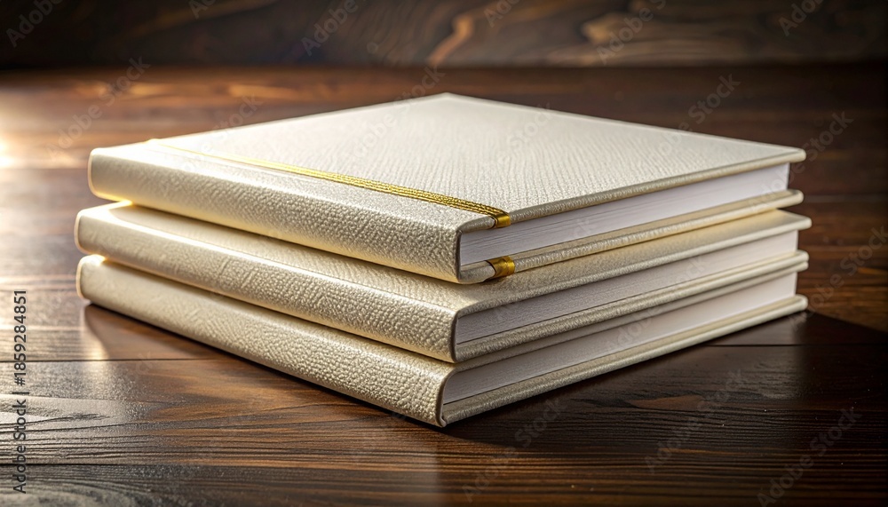 Stack of four creamcolored hardcover books with gold trim on dark wooden table #1859284851