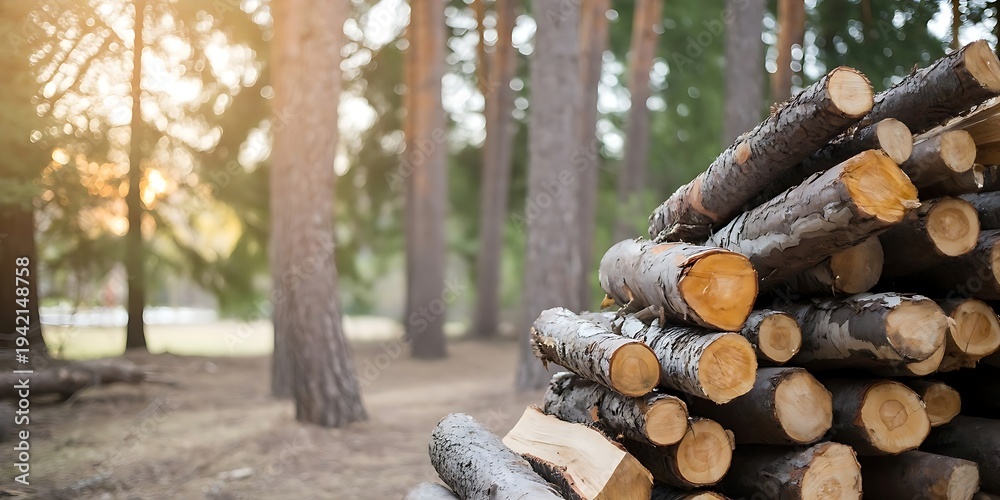 Stack of freshly cut firewood in serene forest setting #1942148758