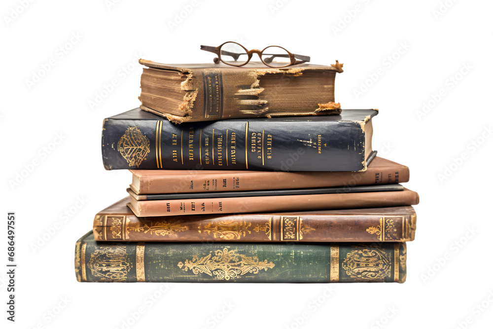 stack of old antique books with retro eyeglasses. generative ai. #686497551
