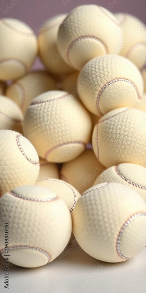 Stack of white tennis balls piled neatly on a flat surface, close-up, leisure #1908910110