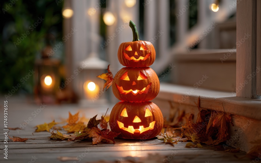 Stacked carved jack-o-lanterns glowing on a porch surrounded by autumn leaves and soft evening lights #1749376515