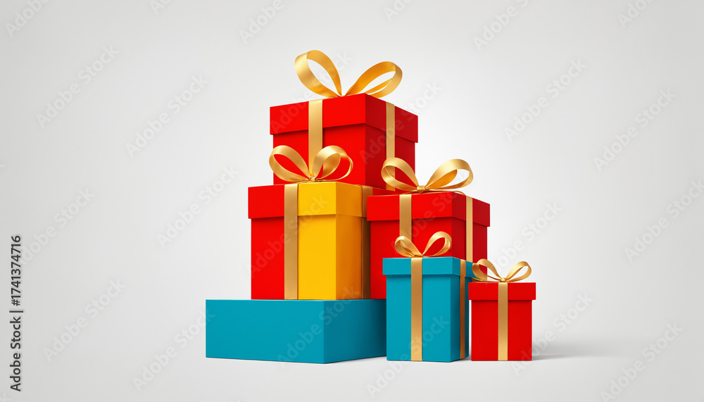 stacked colorful gift boxes with gold ribbons on a neutral white background #1741374716