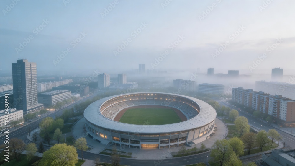 Stadium Under the Morning Haze: An aerial view of a majestic stadium bathed in the soft glow of dawn, shrouded in a gentle mist, evokes a sense of anticipation and the promise of the day's event. #1942430991