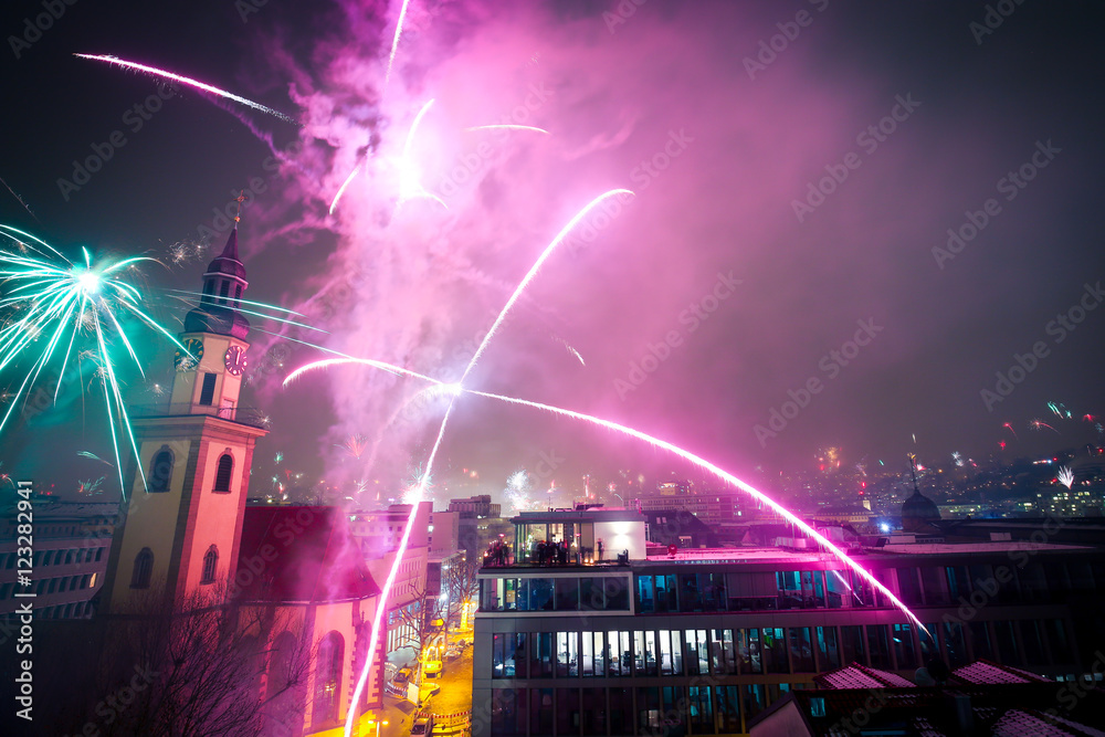 Stadtpanorama von Stuttgart zu Silvester mit Feuerwerk #123282941