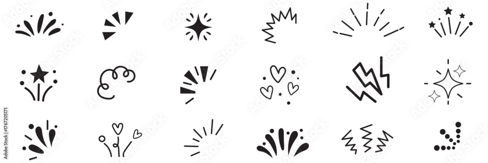 Star background confetti set. Hand drawn doodle star shapes and birthday confetti with cute sparkle, holiday twinkle brush elements, and glowing cartoon kid pattern. Vector illustration #1767205171