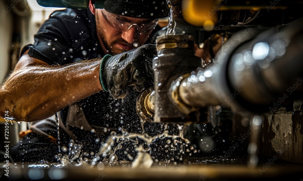 Stationary water engineer at work. plumber carefully fixes a leak from tubes using a wrench. #721096174