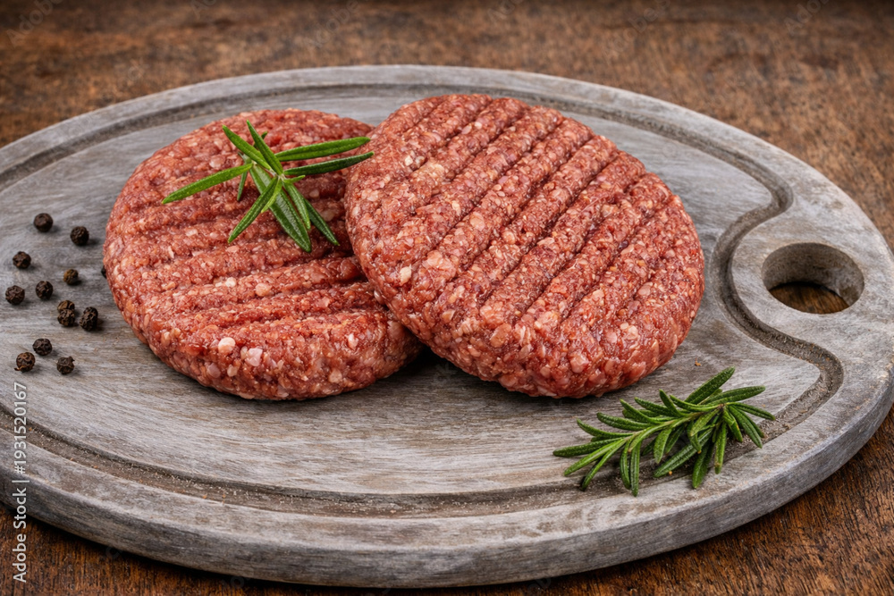 Steaks hachés de boeuf crus sur une planche à découper #1931520167