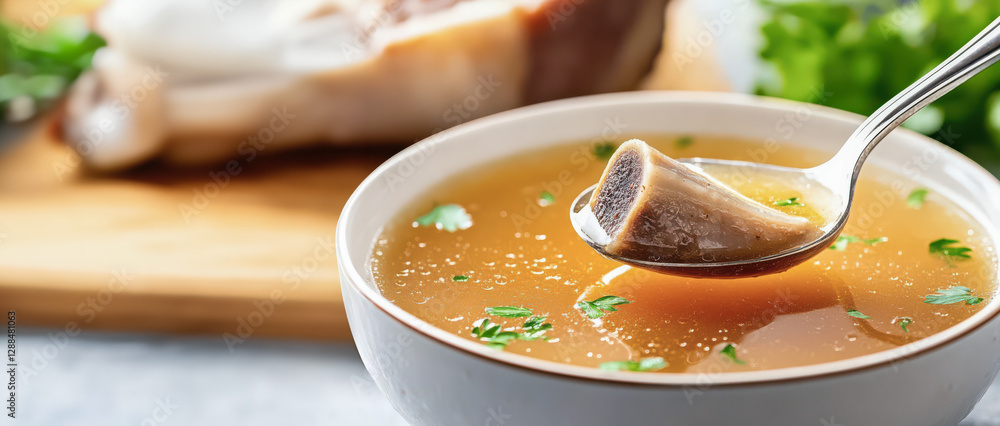 Steaming bone broth in rustic ceramic bowl, sprinkled with bright parsley, revealing rich marrow piece on silver spoon, promising hearty nutrition #1288481063