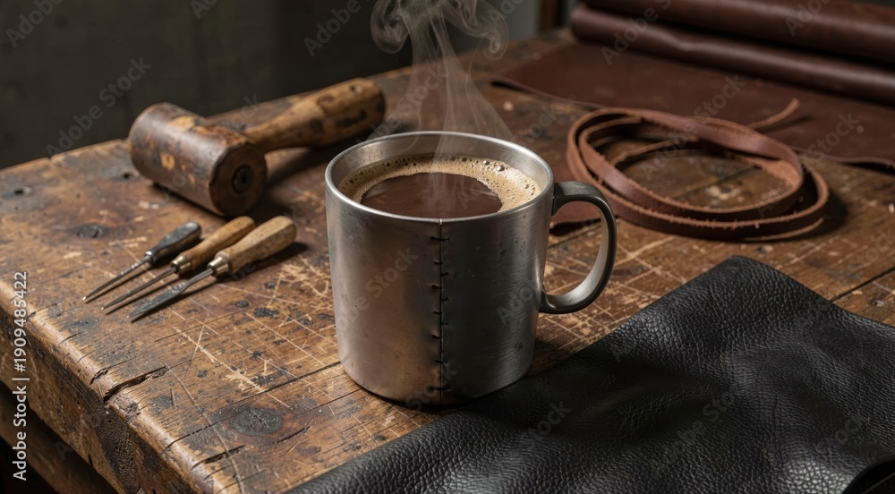 Steaming coffee in metal mug on leather workbench with tools #1909485422
