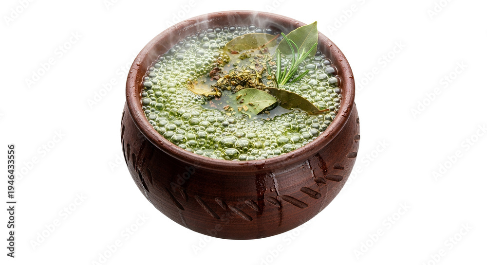 Steaming herbal concoction in rustic earthenware bowl on white studio background. #1946433556