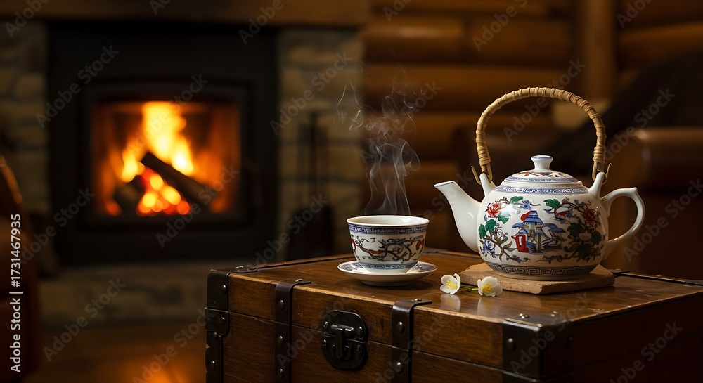 steaming jasmine tea, placed on a polished, antique wooden chest in a rustic, fire-lit cabin. A glowing fireplace in the background. #1731467935