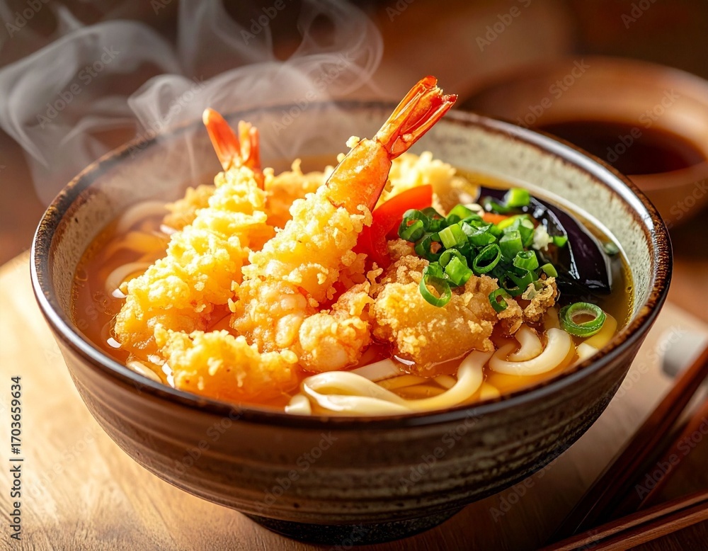 Steaming tempura udon with shrimp and vegetables. #1703659634