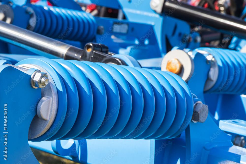 Steel blue spring as part of heavy agricultural, industrial machine. Technology #1966045176