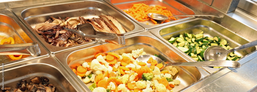 steel trays with plenty of vegetables cooked and raw in the cafe #256354189